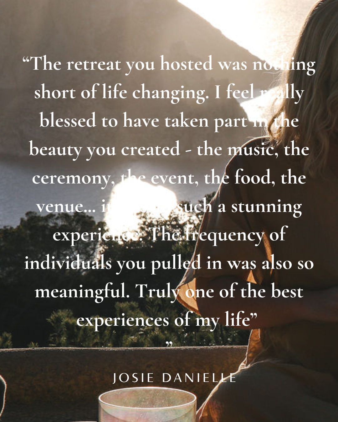“The retreat was really an experience of coming home to my heart. I entered as a grief stricken, judgmental, disconnected female. I was unable to see my own power, and share vulnerably and be seen by others. Through the 6 day immersion I was nourished on all levels. I loved journeying with rose and cacao, and found the voice activation workshop to be the most impactful. There are now levels of my voice that I did not know I had access to. I really enjoyed the meals that were cooked by Chris - everyday was a delicious delight. Chris pours his heart into his hands when he cooks and was so patient to cater for everyone. As a gluten free person, I felt well looked after. The retreat was very homely, and the presence of a family made it more loving, and I learned so much from being around Violet, that helped my inner child come alive! Es Vedra was absolutely magical. Being able to visit Josie's house was a gift. The energy and peace was so magnetic. I experienced immense feminine healing and sisterhood, and felt so supported and seen by everyone. Since coming back home, I have become more confident to use my voice, share my truth, deeper acceptance of myself and others, and felt so encouraged to be who I am. I no longer feel like a victim, and although there is more magic to unfold and heal from, this was a pivotal moment for me that I will always treasure in my heart. Thank you Josie for your open heart, wisdom and presence - a true Angel.”