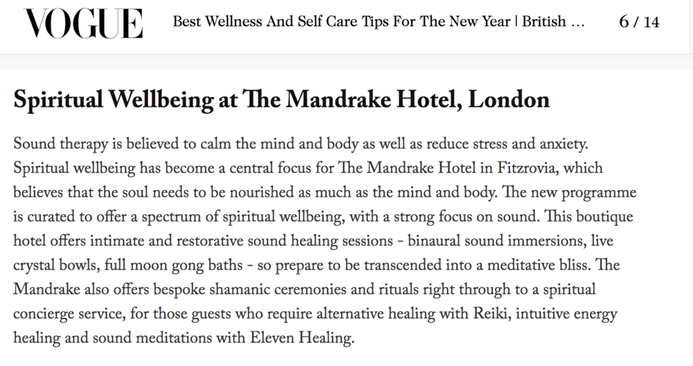 “The Mandrake has built up a strong reputation as the go-to hotel for holistic therapies, including cacao ceremonies and shamanic drumming circles, performed by some of the cities best specialists and healers. One of the most transformative treatments is the healing and private sound bath with reiki master Josie, whose acoustic massage sends you into a dreamlike state. There are also meditation sessions with Catherine Turner, who can get even the most stressed out, anxiety ridden clients to breathe deeply, chant and clear their minds. Even better - combine the two - it’s the closest you’ll get to an out of body experience..” Tatler
